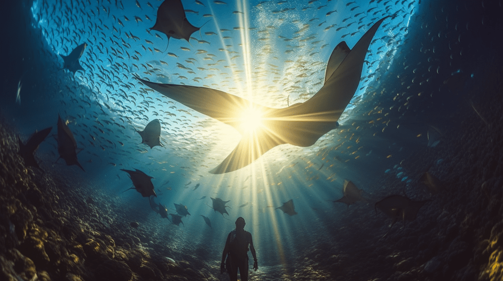 Diver in the ocean surronded by schools of manta rays, eagle rays and barracudas hyper realistic, 8K