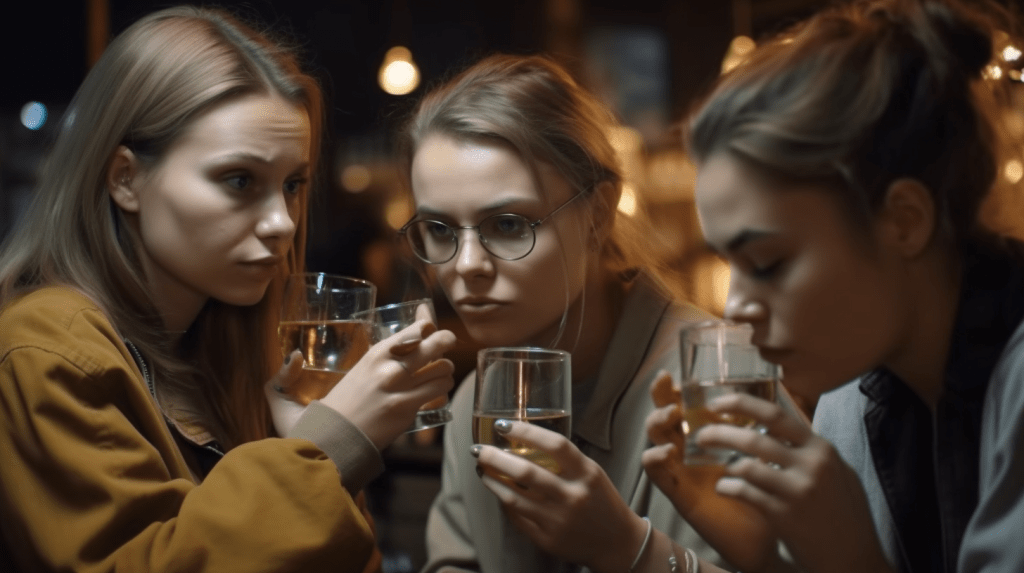 Girls in a pub drinking vodka shots hyper realistic, 8K --ar 16:9 --v 5 --s 500