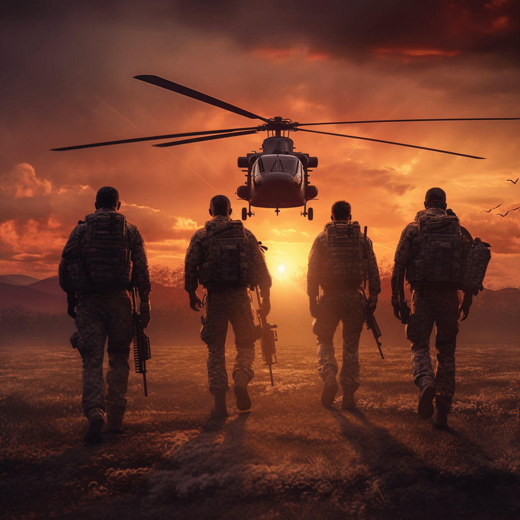 Four soliders walking back from a kill, with choppers and sunset in the background stunning, intricately detailed, beautifully color-coded, octane render, hyper realistic, 8k --v 5.1